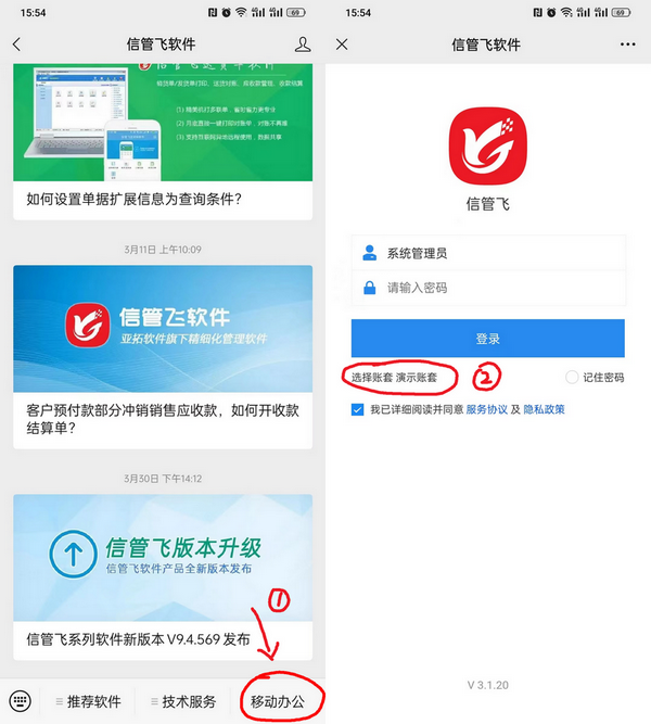 在“信管飛軟件”微信公眾號界面,點擊右下角“移動辦公”可彈出軟件登錄界面。如下圖所示: