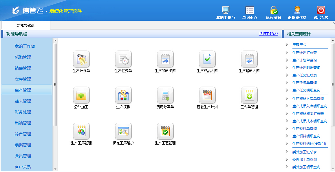 包括功能:生產模板、生產計劃單、生產任務單、生產領料出庫單、生產成品入庫單、生產退料入庫單及智能生產計劃等。