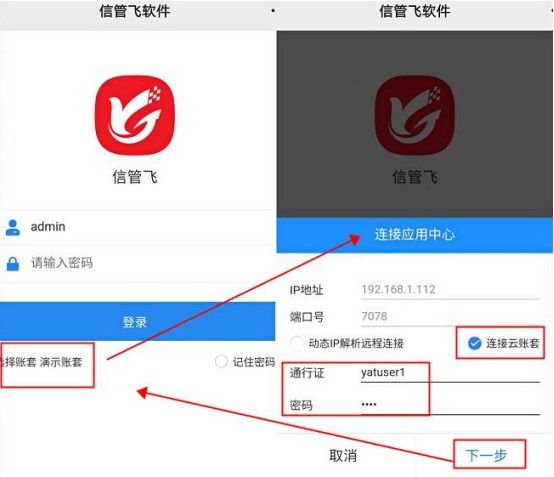 ????在彈出的登錄界面。點擊選擇賬套,勾選動態ip解析遠程連接或連接云賬套,輸入購買后分配的解析賬號和密碼或通行證和密碼。點擊下一步,進入選擇賬套界面。選擇下賬套,點擊選擇賬套,進入登錄窗口,默認登錄操作員是:admin(系統管理員),密碼為自己設置的密碼(如沒有密碼,直接點擊登錄)。如需其他操作員登錄,可電腦端員工信息中查看員工對應的員工編碼,輸入此信息登錄。如下圖所示: