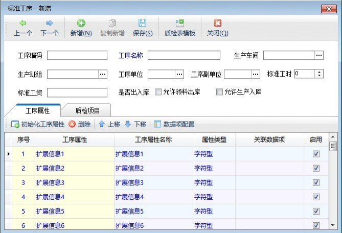 工序屬性:選填項,勾選啟用多個擴展字段分配不同的工序屬性名稱、設置屬性類型(字符型、數值型、數據字典)可以關聯商品編碼、商品名稱、規格、單位、數量、加工完成量等數據項。