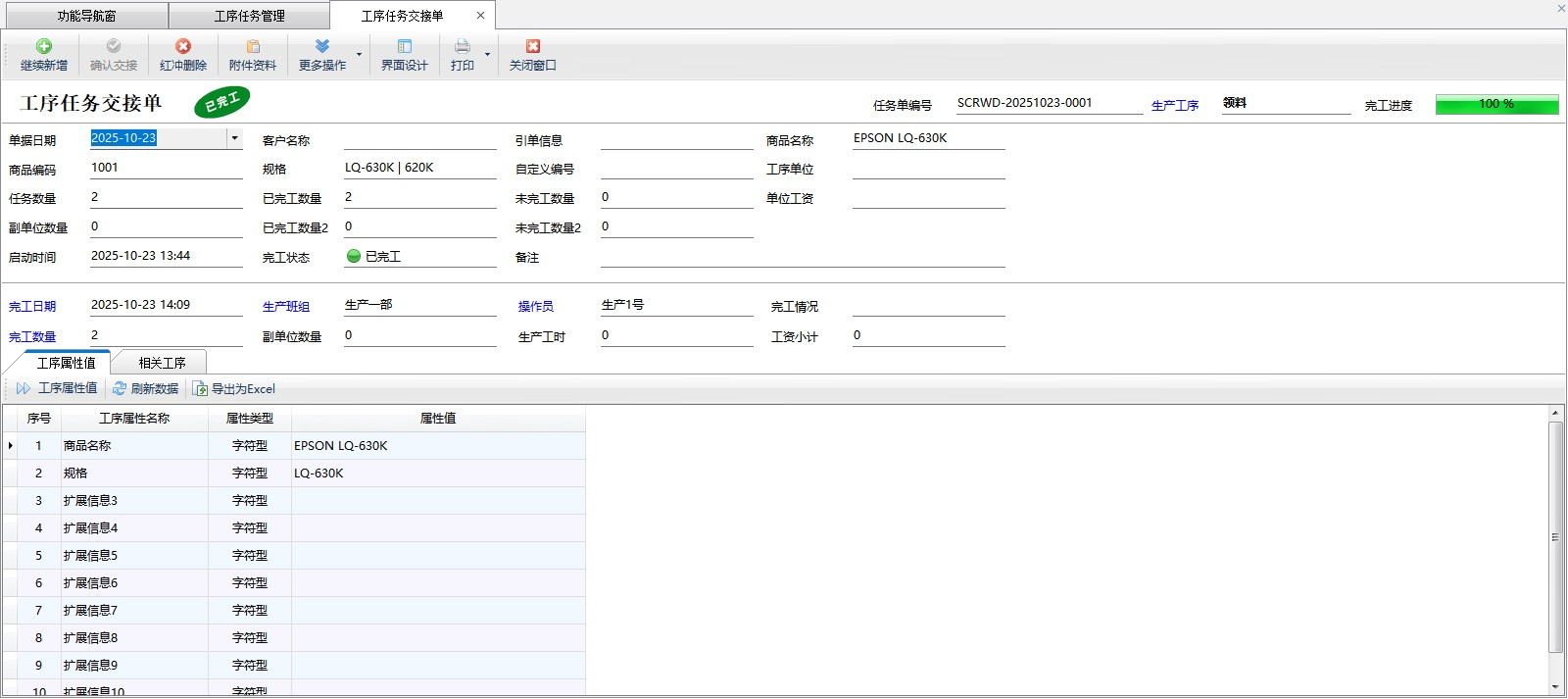 完工交接:點擊“完工交接”可以打開工序任務交接單界面,完工日期、生產班組、操作員、完工數量為必填項,點擊確認交接,單據狀態更新為已完工。
