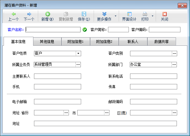 ????(1)客戶名稱為必填項,其他數據為選填項目,可根據情況進行錄入。建議填寫“客戶簡稱”,這樣后續客戶查重時可以提高匹配度。客戶性質分為客戶、供應商、客戶及供應商三種。客戶類別可進行選擇設置。客戶的所屬業務員和所屬部門也可根據情況設置。
