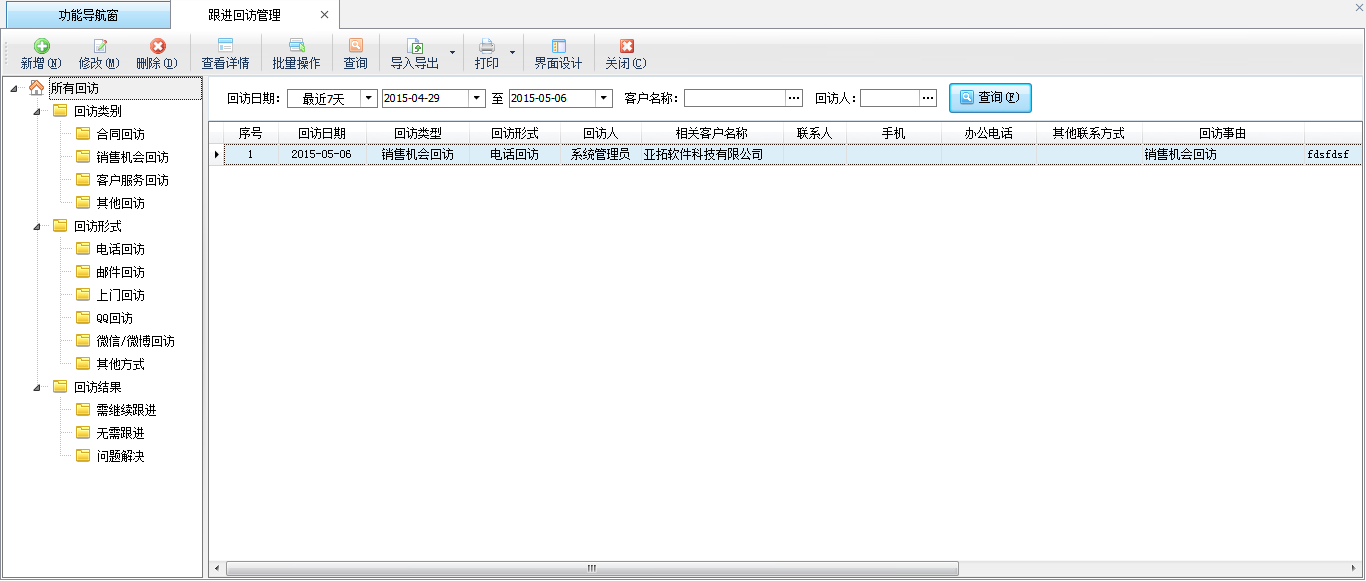 ????跟蹤回訪用于管理對銷售機會、合同、客戶服務單等進行跟蹤回訪,回訪包括電話回訪、郵件回訪、短信回訪、上門回訪、QQ/微博/微信回訪等各種形式。支持對未解決的回訪進行再次跟蹤回訪。軟件支持在相應功能中發起回訪錄入回訪記錄,也可以在跟蹤回訪管理中錄入回訪記錄。
