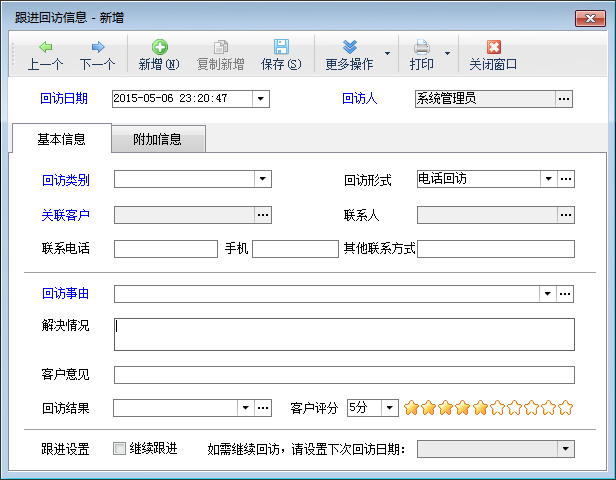 跟進回訪:點工具欄中的“跟進回訪”按鈕,可以對當前的客戶服務單記錄進行跟進,并錄入回訪情況。點工具欄中的“回訪記錄”按鈕,可以查看歷次回訪記錄。