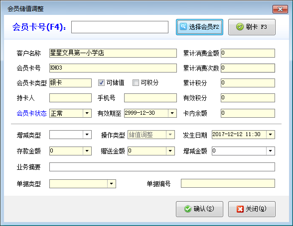 調整儲值:在工具欄中點擊“調整儲值”按鈕,可以打開“會員儲值調整”窗口,選擇會員后,可以調整此會員儲值卡的卡內余額,增減類型支持“儲值增加”及“儲值減少”兩種。儲值增加時,會員卡內余額增加,儲值減少時,會員卡內余額減少。