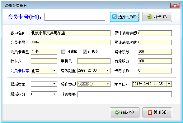 | 7 | 調整會員積分 | 可以調整會員積分卡的卡內有效積分,增減類型支持“積分增加”及“積分減少”兩種。積分增加時,會員卡內積分增加,積分減少時,會員卡內積分減少。 |