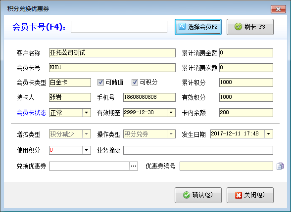 積分兌卷:在工具欄中點擊“積分兌卷”按鈕,可以打開“積分兌換優惠券”窗口,選擇會員后可以錄入一定積分進行兌換優惠券操作。