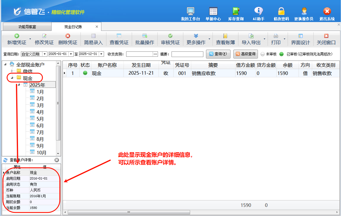 ????點擊工具欄中的“查看詳情”按鈕,可查看統計結果中的任一日記賬明細。