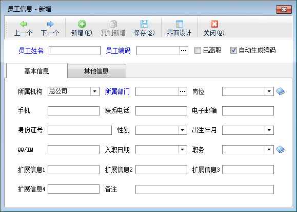 員工編碼:必填數(shù)據(jù)項(xiàng),如果不填寫,則軟件會自動根據(jù)姓名的拼音頭作為編碼。