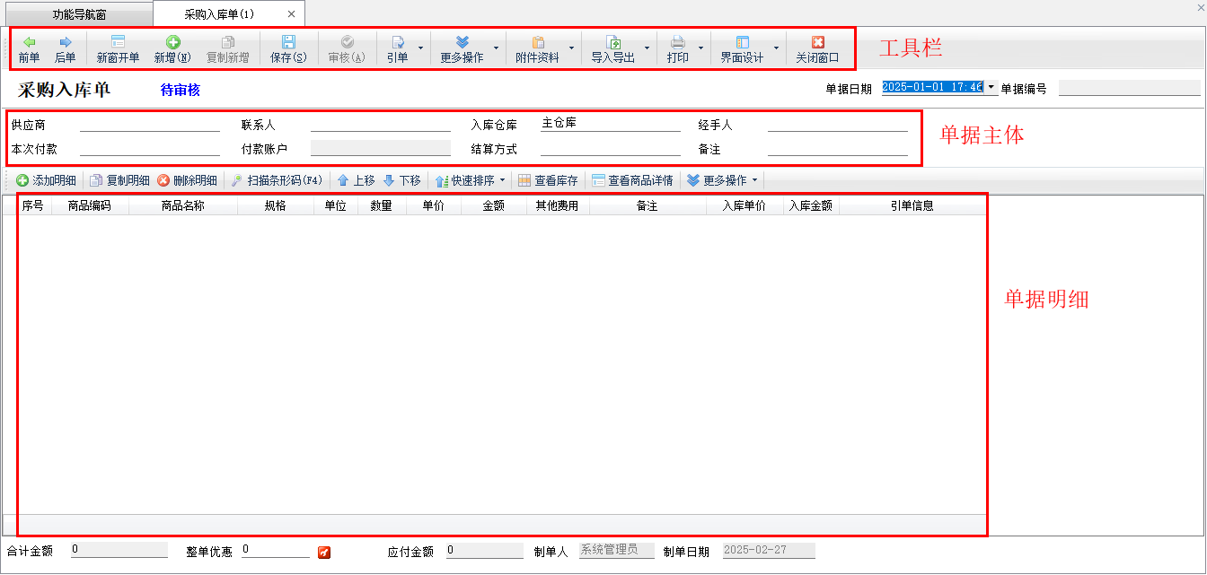 ????在功能導(dǎo)航中點(diǎn)“采購管理”—》“采購入庫單”,進(jìn)入采購入庫單錄入界面,單據(jù)界面分為“工具欄”、“單據(jù)主體”、“單據(jù)明細(xì)”三部分。