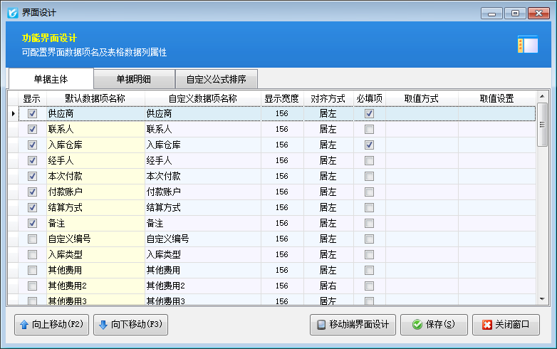 界面設(shè)計(jì):點(diǎn)“界面設(shè)計(jì)”按鈕可以對單據(jù)界面上的數(shù)據(jù)項(xiàng)進(jìn)行自定義,實(shí)現(xiàn)企業(yè)的個性化需求。