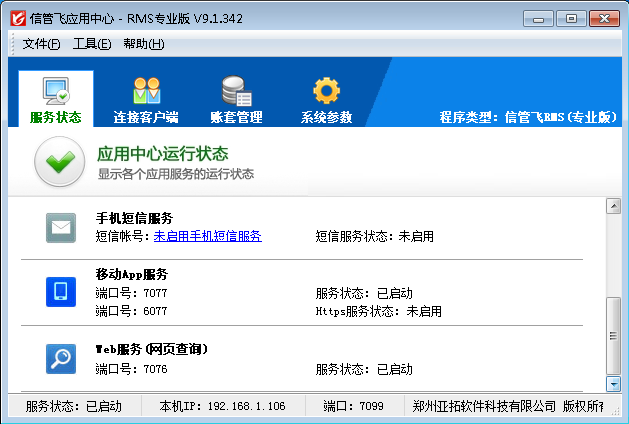 ????應用中心的運行狀態主要包括:軟件授權服務、數據庫引擎服務、動態 IP 解析服務、手機短信服務、移動 APP 服務、Web 服務(網頁查詢)、云打印服務等。部分服務在用戶購買了相應的擴展功能模塊才會顯示。