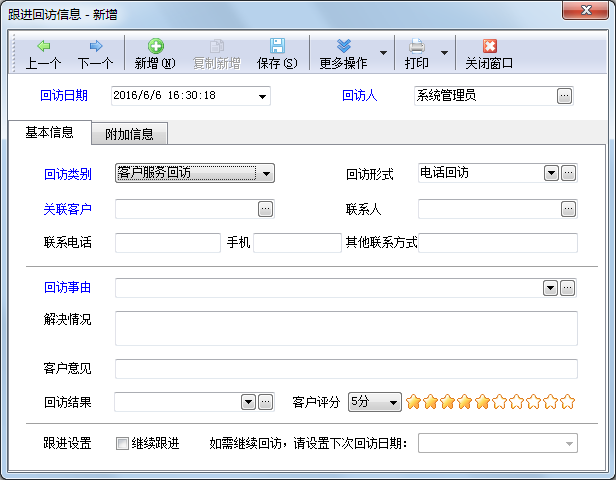 ????跟進回訪:點工具欄中的“跟進回訪”按鈕,可以對當前的客戶服務單記錄進行跟進,并錄入回訪情況。點工具欄中的“回訪記錄”按鈕,可以查看歷次回訪記錄。
