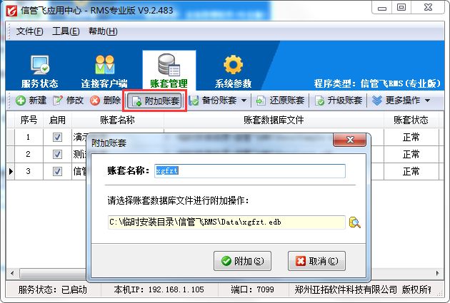 ????4、附加賬套:可以將文件夾中的已經存在的賬套數據文件附加進來,附加進來的賬套,客戶端可以連接,如下圖所示。