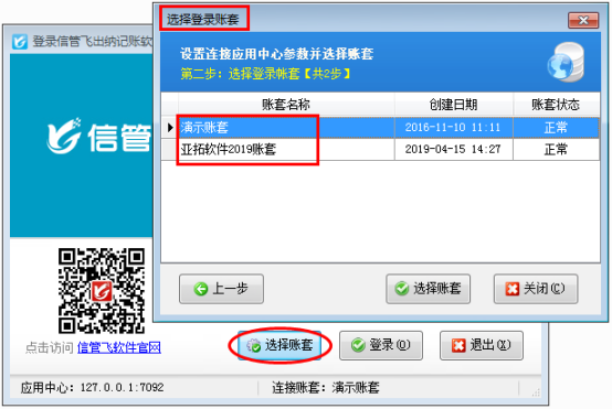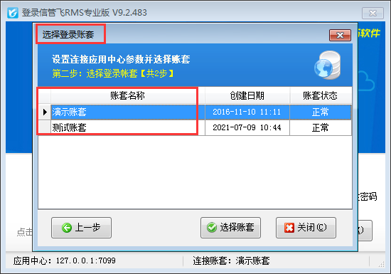 ????從新打開應用中心后,電腦右下角會顯示應用中心圖標。然后打開客戶端程序(藍色圖標),登錄界面點擊“選擇帳套”,然后下一步,然后會出現選擇登錄帳套窗口,此時顯示的可登錄的帳套列表。剛才已停用的“信管飛帳套”已不在列表內,無法選擇到了,如圖所示。
