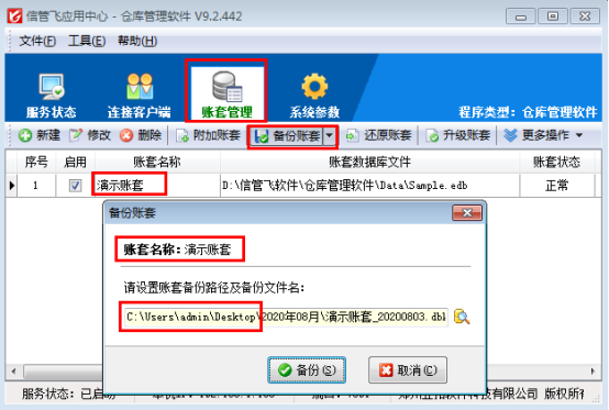 ????設置好備份目錄后,返回至應用中心程序“賬套管理”界面,選擇一個賬套,點擊“備份賬套”可以看到彈出的備份賬套的界面保存目錄為設置的保存目錄“桌面”上,如下圖所示: