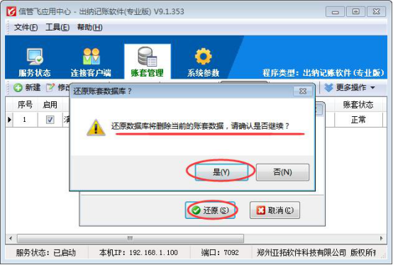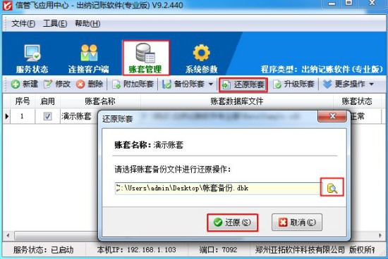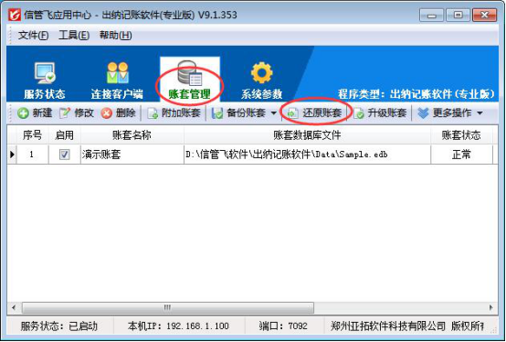 ????亞拓軟件旗下的信管飛RMS、信管飛倉庫管理軟件、信管飛送貨單軟件、信管飛出納記賬軟件、信管飛票據打印軟件等軟件程序安裝后會顯示兩個圖標,一個是應用中心程序(紅色圖標),一個是客戶端程序(藍色圖標)。這些軟件都含有賬套管理功能,在應用中心里面可以建立多個賬套,已使用的帳套如果不再繼續使用,可以停用帳套,停用帳套后,客戶端程序登錄時無法連接該帳套。我們以信管飛出納記賬軟件專業版為例演示一下如何停用帳套。