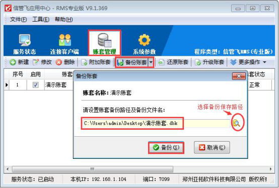 ????打開“信管飛RMS應用中心”,在應用中心主界面中點擊“賬套管理”進入賬套管理界面,選中我們需要備份的賬套,點擊“備份賬套”按鈕,可以彈出備份賬套的對話框,在此我們可以設置備份出來的賬套備份文件存放路徑實現對賬套的備份操作,如下圖所示。