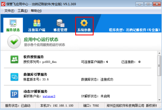 ????信管飛RMS、信管飛倉庫管理軟件、信管飛出納記賬軟件、信管飛送貨單軟件和信管飛票據打印軟件都由客戶端程序和應用中心程序兩部分組成,應用中心可以全面掌控軟件的運行情況,可以隨時查看各類服務的運行狀態,主要包括軟件授權服務情況、數據庫引擎服務情況、動態IP解析服務情況、手機短信服務情況等。下面我們以信管飛RMS專業版為例介紹一下應用中心的服務狀態。