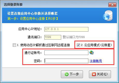 ????在客戶端程序登錄窗口點擊“選擇賬套”,然后啟用下云應用模式(云賬套),如下圖所示: