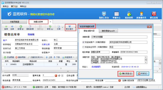 ????微信消息參數設置完成后,新開一個銷售出庫單,客戶調用已關聯客戶,輸入明細內容后點擊保存按鈕,然后在工具欄“更多操作”按鈕下選擇“發送微信消息”點擊“確認發送”會發送到客戶關注的微信公眾號平臺界面。如下圖所示: