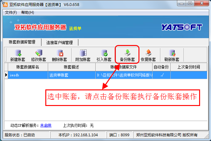 ????先在原主機上登錄軟件檢查下數據,確認沒問題后,打開亞拓軟件應用服務器,在亞拓軟件應用服務器上選中賬套,點擊“備份賬套”執行備份賬套操作,點擊備份賬套后,會彈出“備份賬套”窗口,可以選擇備份文件所存放的路徑(一般情況下默認存放在軟件的安裝目錄下DBBackup文件夾下),然后將剛才備份的賬套數據文件通過U盤或者移動硬盤等方式拷貝到新主機電腦上。