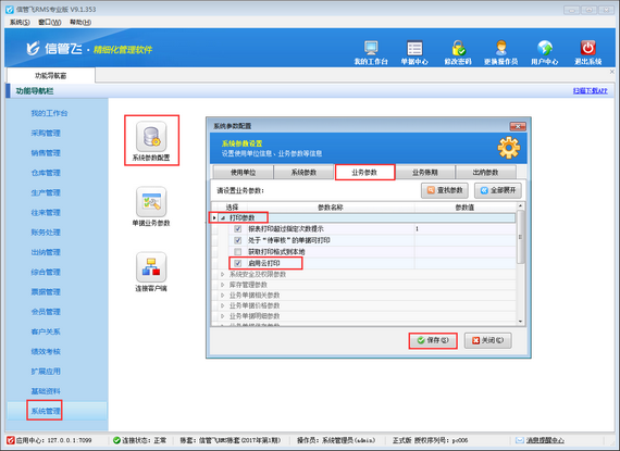 ????云打印機設備設置完成后,登錄軟件,需要設置云打印參數,在功能導航窗點擊“系統管理”->“系統參數設置”->“業務參數”打開業務參數設置窗口,在“打印參數”內打鉤啟用“啟用云打印”參數,然后點擊“保存”按鈕保存設置,如下圖三所示。