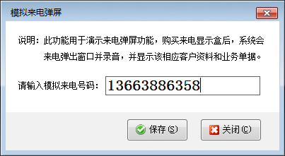 ????模擬來電:此功能可以實際模擬演示來電彈屏功能,在模擬來電彈屏窗口輸入模擬來電號碼,點擊“保存”后系統會自動彈出來電彈屏窗口,如下圖所示: