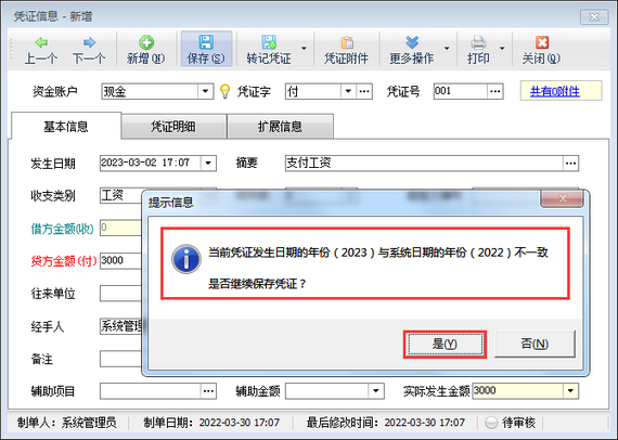????參數設置完成后,在功能導航窗選擇“出納管理”—》“現金日記賬”進入現金日記賬界面,新增現金日記賬,修改發生日期為非當前年份,保存日記賬憑證時,可看到系統彈出提示信息“當前憑證的發生日期的年份(XXXX)與系統日期的年份(XXXX)不一致,是否繼續保存憑證?”,如下圖所示。