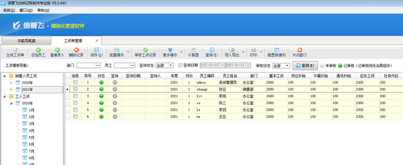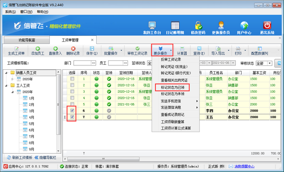 ????信管飛出納記賬軟件專業(yè)版包括工資管理功能,支持自定義工資模板,可根據(jù)設(shè)置的工資模板快速生成工資單,支持從上月工資單復(fù)制工資項(xiàng)目數(shù)據(jù),工資項(xiàng)目數(shù)據(jù)錄入完成核對(duì)無(wú)誤后審核生效,審核后不再支持直接修改。如果工資記錄較多,逐條審核工資記錄會(huì)比較耗時(shí),軟件支持批量審核工資記錄,可節(jié)省時(shí)間提高工作效率。本篇文章介紹一下出納記賬軟件中如何批量審核工資記錄?