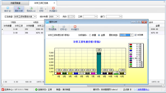 ????員工計(jì)件工資匯總表界面支持根據(jù)匯總類型、統(tǒng)計(jì)年度、月份、工序等條件來(lái)進(jìn)行統(tǒng)計(jì)所有員工的計(jì)件工資情況,包括員工姓名、工序、計(jì)件數(shù)量、計(jì)件工資等數(shù)據(jù)。另外計(jì)件工資年度工資匯總表也支持圖形分析功能,可以直觀查看每個(gè)員工在本年度各月份工資差異。在工具欄中也支持導(dǎo)出Excel文件、打印當(dāng)前記錄、界面設(shè)計(jì)(可自定義當(dāng)前界面顯示數(shù)據(jù)項(xiàng))。