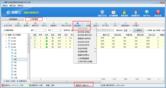 ????操作員權(quán)限保存成功后,返回登錄窗口,選擇操作員“張來(lái)”登錄軟件,打開(kāi)“綜合管理”—》“工資單管理”界面,選擇已審核的工資單記錄,在工具欄的“更多操作”下可以看到“反審工資記錄”已變?yōu)榛疑瑹o(wú)法選擇。如下圖2所示: