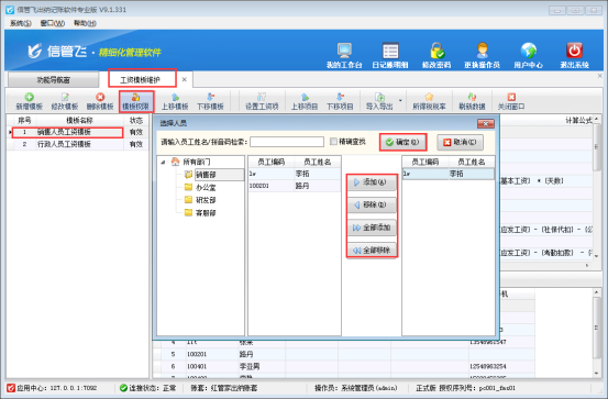 ????添加員工:工資模板設(shè)置好之后,可以添加需要按照此工資模板來(lái)計(jì)算工資的相應(yīng)人員。