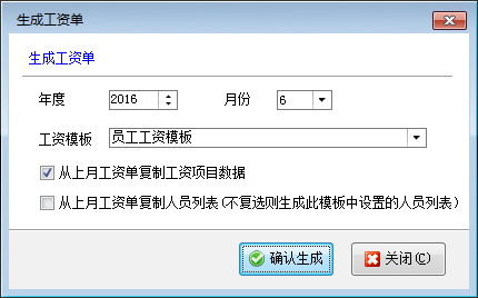 ????生成工資單:點(diǎn)擊“生成工資單”按鈕,可以彈出生成工資單窗口,如圖2所示,在此窗口選擇年度、月份及相應(yīng)的工資模板,然后點(diǎn)擊“確認(rèn)生成”按鈕即可生成相應(yīng)的工資單,另外也可以打勾選擇“從上月工資單復(fù)制工資項(xiàng)目數(shù)據(jù)”及“從上月工資單復(fù)制人員列表(不復(fù)選則生成工資發(fā)放模板中設(shè)置的相應(yīng)人員的工資)”選項(xiàng),打勾復(fù)選,本月的工資項(xiàng)目數(shù)據(jù)則可以復(fù)制上月的工資項(xiàng)目數(shù)據(jù),不復(fù)選則不會(huì)復(fù)制上月的工資項(xiàng)目數(shù)據(jù)。