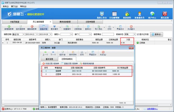 ????做過還款單進行還款處理后,重新查看借款詳情,此時可以看到,欠款金額-1000元已清零,如下圖所示。