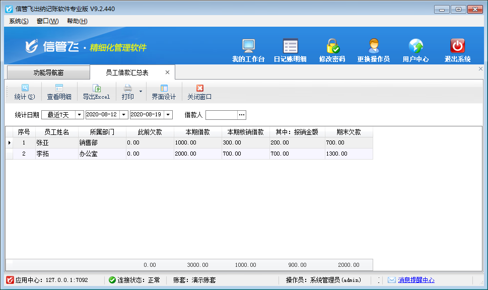 ????員工借款匯總表界面支持根據統計日期、借款人來進行統計員工的借款、核銷情況,包括員工姓名、所屬部門、此前欠款、本期借款、本期核銷借款、其中:報銷金額、期末欠款等信息。另外在工具欄中支持查看明細、導出Excel文件、打印當前記錄、界面設計(可自定義當前界面顯示數據項)。