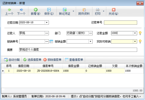 ????在功能導航窗,點擊“綜合管理”—》“還款單管理”打開還款單管理界面,新增還款單,選擇還款人,關聯借款單、報銷單,錄入還款金額(還款金額錄入負數,代表報銷金額大于借款金額時,需要給員工找錢!)進行還款處理就好,如下圖所示。