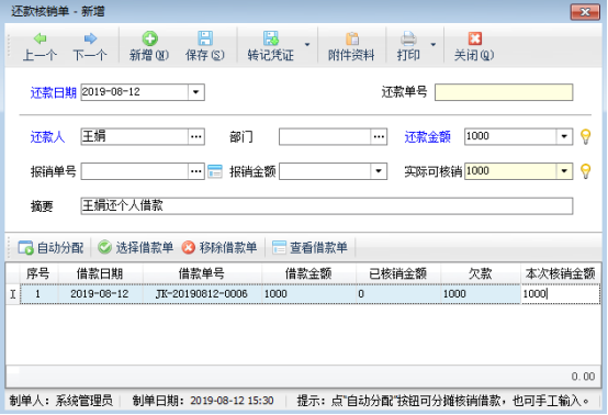 ????還款核銷:在借款單列表中,選擇一個借款單,點擊工具欄中的“還款核銷”按鈕,系統彈出“還款核銷單”窗口,在窗口中錄入還款信息后,點擊“保存”即可。如下圖所示: