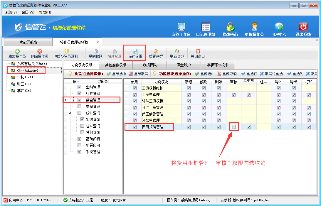 ????在功能導航窗點擊“系統管理”—》“操作員及授權”打開操作員管理及授權界面,選擇操作員“張亞”,在功能模塊權限界面,選擇“綜合管理”—》“費用報銷管理”,把費用報銷管理“反審修改”權限勾選取消,然后保存權限設置,如下圖所示: