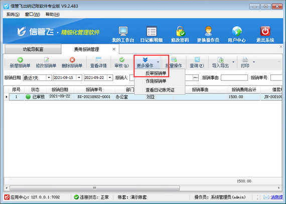 ????權限設置完成后,使用操作員“張亞”登錄軟件,打開費用報銷管理界面,在工具欄點擊“更多操作”,可以看到“反審報銷單”按鈕為灰色的,操作員無法反審費用報銷單。如下圖所示:
