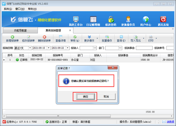 ????費用報銷單保存審核后默認不允許直接修改,但是部分客戶需要對已審核的費用報銷單進行修改,軟件支持反審費用報銷單功能,如下圖所示。本篇文章介紹一下出納記賬軟件中如何設置操作員不允許反審費用報銷單?