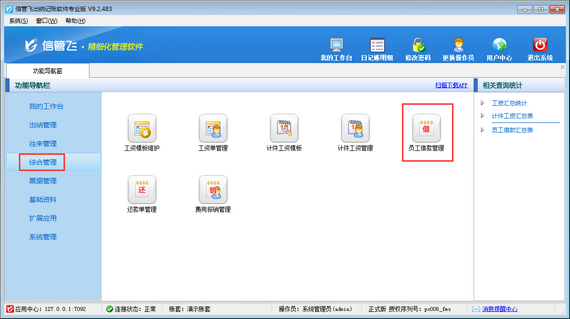 ????在功能導航窗點擊“綜合管理”—》“員工借款匯總表”即可進入員工借款匯總表界面,如下圖所示。