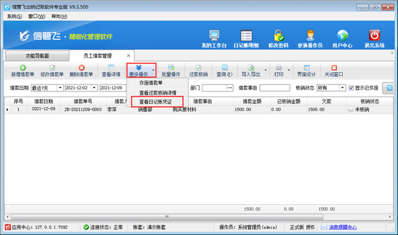 ????更多操作:點擊“更多操作”按鈕,下拉列表下含:作廢借款單、查看還款核銷詳情、查看日記賬憑證操作。