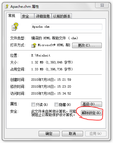 最近有用戶反映無法打開系統的幫助文件(CHM格式),出現空白頁面提示:已取消到該頁面的導航(IE8),如果是IE6會出現錯誤提示:取消操作,Internet Explorer 無法打開您請求的頁面。此問題是由于升級了微軟的一個補丁導致的,由于CHM文件容易為黑客利用,所有默認從網站上下載的CHM文件,會被鎖定。找到了原因,解決起來也很簡單:在CHM文件上右鍵,在彈出的菜單點“屬性”,然后在屬性窗口點“解除鎖定”,然后點“應用”按鈕即可。如下圖所示: (圖片引用自網絡)