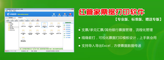 紅管家票據打印軟件是亞拓軟件針對企事業單位票據管理及打印需求而開發的一款票據管理軟件票據通軟件、支票打印軟件、快遞單打印軟件、萬能打印軟件、套打軟件),主要包括支票管理、承兌匯票管理、其他票據管理(銀行進賬單、電匯憑證等)、快遞單管理、萬能票據打印、票據打印模板管理、票據查詢檢索等功能。
