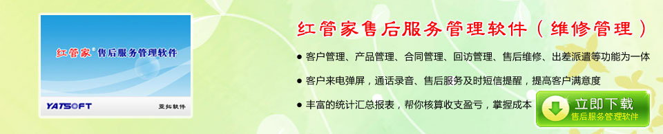 紅管家售后服務管理軟件是一款針對發貨、安裝、技術支持、維修等為一體的售后維修和客戶服務管理系統,主要包括客戶資料管理、合同管理、銷售出貨退貨、配件/零件采購、售后服務管理、發貨郵寄管理、客戶回訪管理、出差派遣管理等。支持短信自動通知、來電彈屏、通話錄音等。   經典售后服務管理軟件(維修管理軟件),歡迎下載試用。下載地址:http://www.yats
