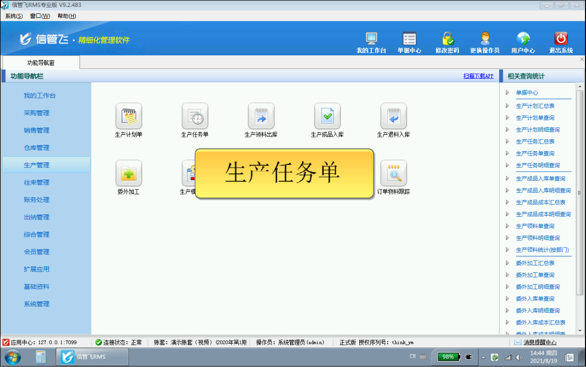 介紹信管飛RMS生產任務單的主要功能和操作步驟。
