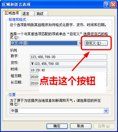 然后打開“自定義區域選項”窗口,點擊時間按鈕查看時間格式。