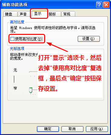 在“輔助功能選項”中,點“顯示”選項卡,去掉其中的“使用高對比度”復(fù)選框,最后點”確定“按鈕保存設(shè)置。重啟電腦,即可解決問題。