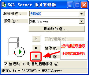 3、在SQL Server服務(wù)管理窗口,點(diǎn)擊“停止”按鈕即可。
